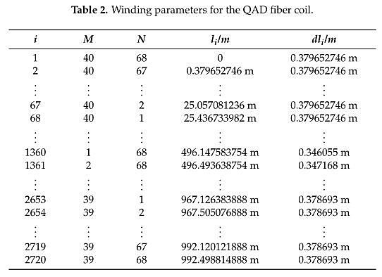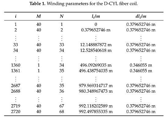The simulated geometric parameters of the two kinds of fiber coils are derived from our laborator IFOG products. The geometric parameters of two kinds of fiber coils are almost the same, which ca be designed as follows: The inner radius Ra outer radius R2, height H, layer number M, loop numbe N, and to tal loop number MN of the two kinds of fiber coils a re 0.11 m , 0.121 m, 0.013 m, 40 layer 68 turns, and 2720 turns, respectively. Additionally, the fiber length L and the effective diameter D c the 7wo kinds of fiber coils are approximately 993 m and 0.115 m, respectively. Based on the geometri structure o f the two kind s of fiber coils, the winding parameters of coils can be calculated, as illustrate in Tables 1 and 2, respectively.