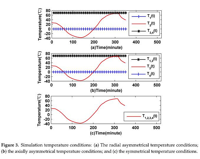 thermal excitation of fiber coils is asymmetric. The initial temperature T0 is »er boundary temperature T14(t) is set to 0 °C, the bottom boundary temperat along with time, the inner boundary temperature T^1 (t) and the outer bound are all set to 70 °C, as illustrated in Figure 3b. In the third temperature scheme, *e T0 is set to 20 0C, the four surface boundary temperatures 了1 ⑴,了2(t), 了3⑴ a the same, as illustrated in Figure 3c. In the three temperature schemes above, fer coefficient h is set as 5 W/(K- m), and each temperature excitation scheme lasts 350S