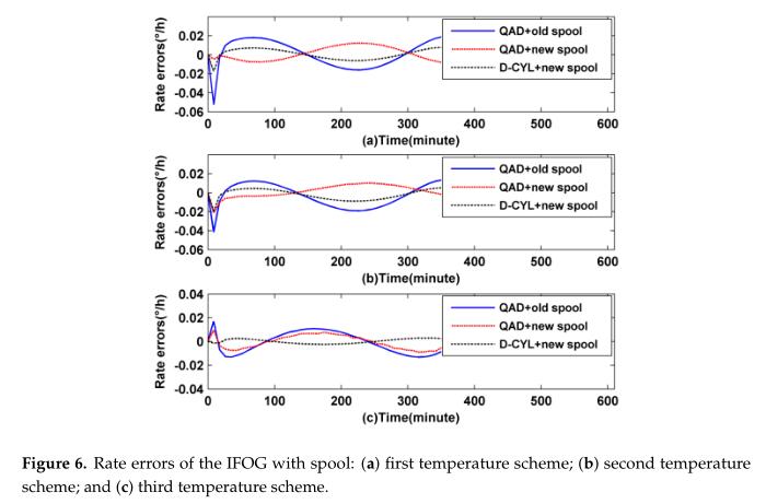 Figure 8 that with the help of a heat-off spool, the QAD IFOG's maximum thermally induced bias value can be minimized to 0.03°/h. If the QAD winding method is meshed with an old spool, the maximum thermally induced bias value will increase to 0.06°/h, as shown by the blue solid line in Figure 8. Through careful observation of the red dotted line and blue solid line in Figure 8 we also find that the heat-off can effectively alleviate any sharp fluctuations for a QAD IFOG, especially at the start, and during heating and cooling time. Simultaneously, regardless of whether the QAD coil is meshed with a new heat-off spool or an old spool, its thermally induced curve levels off under low temperature conditions, as shown in Figure 8b. The reason may be that the fiber and adhesive are more sensitive to high temperatures than low temperatures. Compared to the two experimental schemes above, the D-CYL scheme has a better temperature performance. Its maximum thermally induced is only 0.012°/h. During the start, heating or cooling time, the thermally induced drift error can be effectively attenuated. Such good results may be attributed to a perfect combination of the heat-off spool and D-CYL winding method, which can provide fine performance.