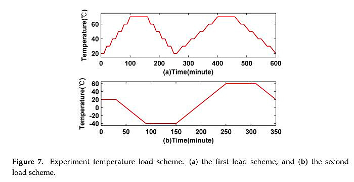 In the first experiment, the temperature is held for 1 h at a temperature point of 70 oC and then held for 10 min at temperature points ot 20, 30, 40, 50, and 60 oC, respectively, as shown in the red line of Figure 7a. To make the experiments more comprehensive, iwo different temperature change rates including 1 oC /min and 0.5 oC /min are also used. In the second experiment, the temperature ie held for 3 0 min at a temp erature point of 2 0 oC and then held for 1 h at temp erature p oints of —40 oC and 60 oC,asshown by the red line of Figure