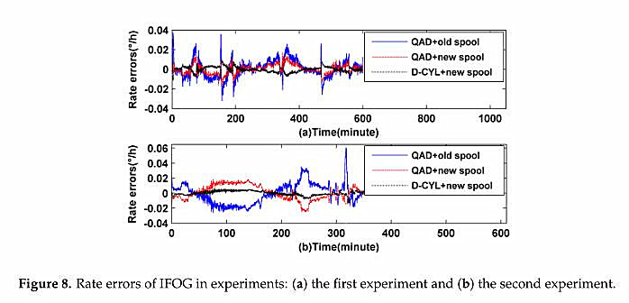 According to the comparison and analysis above, we can draw a conclusion that the QAD coil itself could suppress the asymmetrical thermal fluctuation influence to a certain extent and the thermal performance can be improved slightly with the help of a temperature homogenizer. However, only with the aid of a heat-off spool is an axially symmetrical temperature environment provided, and the D-CYL coil can achieve fully its thermal performance. Through the analysis and discussion mentioned above, we can now say that a D-CYL winding coil meshed with a heat-off spool has a better thermal performance than the traditional QAD products. The results fully verify the superiority of the D-CYL method in suppressing thermally induced bias drift errors.